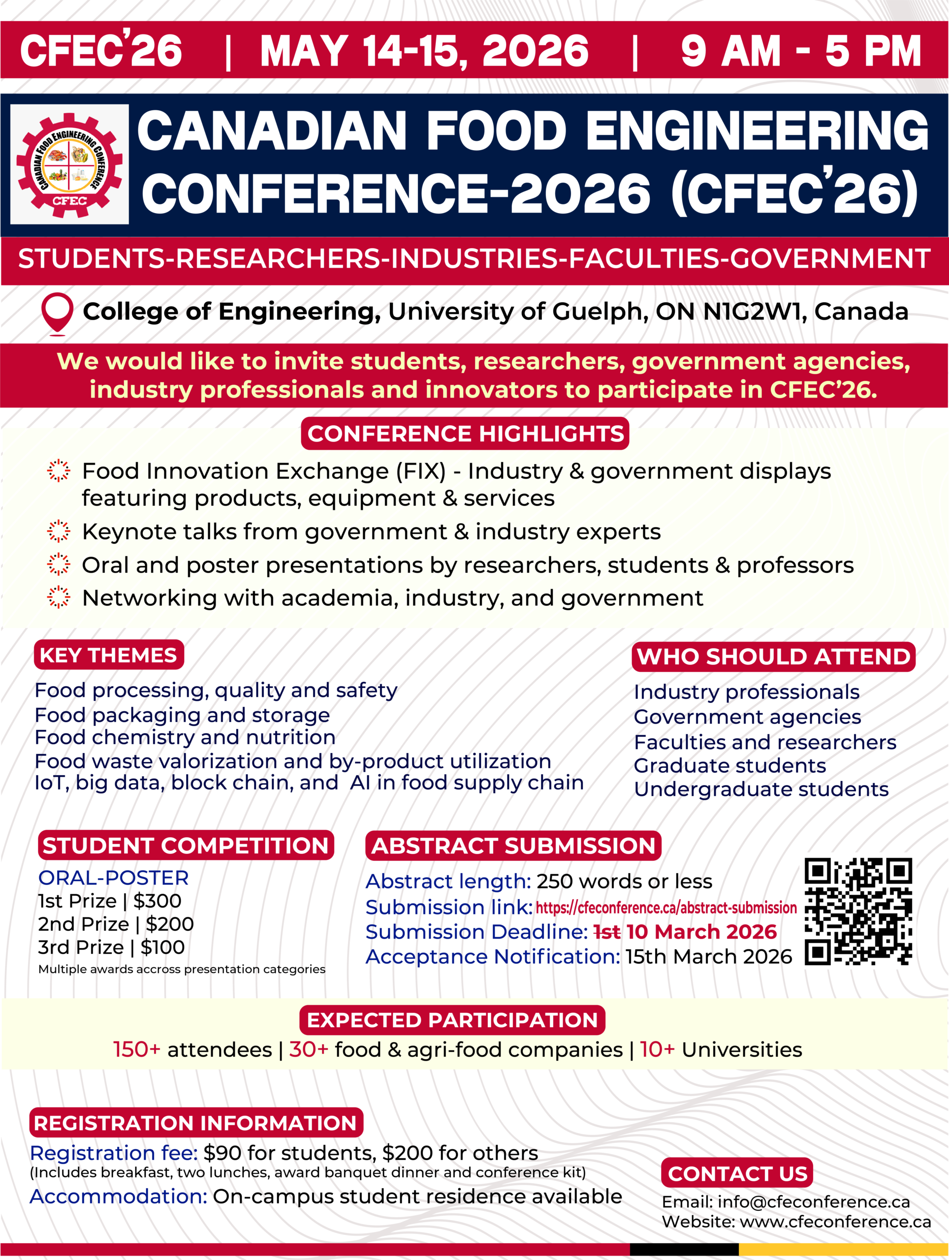 Don’t miss this incredible opportunity to collaborate, innovate, and inspire at CFEC 2026. Together, we can advance food science and engineering for a better tomorrow